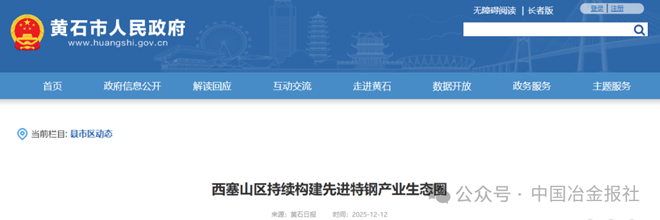 12月12日,黄石日市人民政府网站发布《西塞山区持续构建先进特钢产业生态圈》一文。